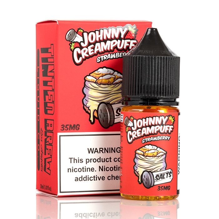 Johnny Creampuff – Strawberry by Tinted Brew Juice Co. is a luscious creation, blending together heavy notes of sliced strawberries intermingled with a generous mixture of whipped cream packed into a sweet puffed pastry to create a premium nicotine salt mixture enhanced with this lemony baked dessert flavor.